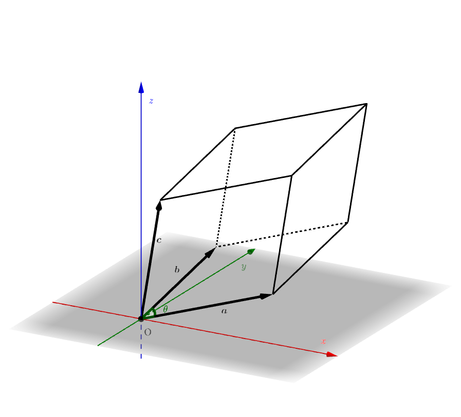 \(\boldsymbol{a}\times\boldsymbol{b}\) と平行六面体の3つ目の辺 \(\boldsymbol{c}\) のなす角を \(\phi\) とおきます。